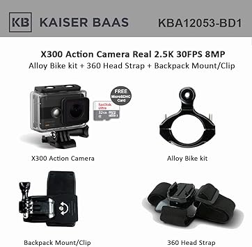 Amazon Com Kaiser Baas Kba12053 X300 Action Camera Real 2 5k 30fps 8mp Electronic Stabilization With Alloy Bike Kit Plus 360 Head Strap With Mount Clip Plus Microsdhc Card 32gb Free Camera